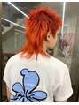 あえて根元の地毛を残したブリーチワークで作るビビットなオレンジヘア。短く切り込んだトップと長く伸ばした襟足のバランスが絶妙なマレットヘアもエッジがきていてかっこいいです。根元残しのブリーチは頭皮もしみないので優しさ◎です!