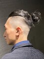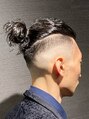 顔まわりは爽快、後ろで束ねた髪は色っぽく、ハイスキンフェードカットのサイドとバックからは男らしさを感じさせます。緩めツイストスパイラルパーマの絶妙なウェーブが、シルエットの美しさを増幅させ、どこから見ても無敵クラスにカッコ良く仕上げました。