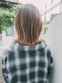 カラーはブリーチハイライトにオンカラーでアッシュベージュカラーで透け感と抜け感を出してます。レングスは外ハネすると肩につくくらいです。表面にレイヤーを入れているのでシルエットがややひし形で小顔印象!!