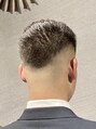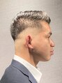 スキンフェードのご要望。スーツ姿でビシッとキマるラインをとっています。清潔感あふれ、芸術性も感じるとてもお洒落なスタイル。全体のシルエットをカッコよくデザインする骨格補正カットを施しています。前髪だけ長めに残してオールバックに仕上げました。