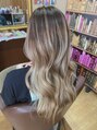 バレイヤージュデザインになります☆トリプルカラーを利用して、コントラスト・ブリーチ後の黄色味を薄めゴールドに変えています!!バレイヤージュは巻くとより良いデザインになりますね☆