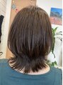 ウルフベースにカット♪外ハネ部分は軽めに、表面のボリューム感は少し残して、ふんわり感を作りやすくしています♪ふんわり感を残すことで、くびれをしっかり出してくれます!!カラーは、ほんのりグレージュにしています♪