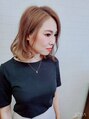 肩くらいのボブでコテでランダムに巻いたスタイル。カラーは明るめのベージュ系。