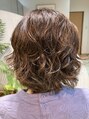 フロントは耳にかけれる長さにカットし、トップにボリュームを持たせるように大きめのロッドで平巻きする。オレンジブラウンの色味でハリコシを出すRカラーでカラーリングしています。