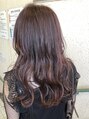 ブリーチなしのピンク系のカラーです。8レベルくらいの中明度の明るさです。毛先中心にゆるくコテで巻いたスタイルです。