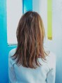 セミロングレングスのレイヤースタイルです。シルエットはひし形になるよう表面の髪にレイヤーをいれています。伸ばしているけど、雰囲気を変えたい方におすすめ◎カラーは明るめベージュカラーにハイライトを入れ立体感を増しています。