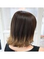 肩レングスのボブ。毛先にアクセントでブリーチカラーを入れています。フォルムも重くなりすぎないようにレイヤーを入れて、毛先を動きやすくしています。外ハネにスタイリングするのもカワイイですね。
