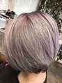 ブリーチで15レベルまでしっかりトーンアップ→バイオレットアッシュで仕上げた前下がりのボブスタイル。インナーのカラートーンを少し下げて奥行きを出しました。