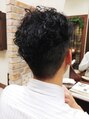 モデルさんはクセ毛の方です。ツーブロックと刈り上げを入れた黒髪のアップバングショートです。髪や頭皮でお悩みのとき気軽にご相談ください。