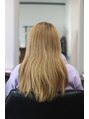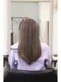 カットは整えて表面にレイヤーを。毛量調整してます。1回目は根元のブリーチを。14レベルの薬剤とブリーチ剤をミックスして明るさを調整しています。2回目はイルミナカラーのヌード(グレージュ)にディープアメジスト(ディープバイオレット)を+しました。