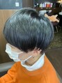 髪型はマッシュショート。全体ブリーチをしてベースはハイトーンへ、濃いめのブルーアッシュをのせて一見落ち着いた感じに
