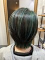ハイライト部分にグリーンを入れてお肌が弱い方なので、地肌に薬剤がつかないハイライトを提案させて頂きました。個性的なのがお好きなのでサイドはめくると刈り上げスタイルです。