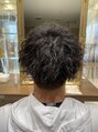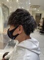 大流行中のツイストスパイラルパーマです。ベースカットは前下がりのマッシュベース、ツーブロックでパーマのボリュームを調整しています。質感は波ウェーブっぽく出ています。重さはやや残して重量感がある感じがカッコイイです。