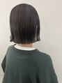 襟足ギリギリのぱっつんボブ。カラーはハイライトをいれて濃いめのアッシュをいれたくすませカラーで髪を柔らかく、立体的にみえるようにしました。