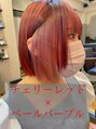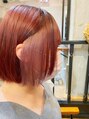 全体はブリーチ履歴を活かして濃いチェリーレッドにカラーして、インナーをケアブリーチで明るくしてからペールパープルにカラーしています。カットは重めのボブスタイルで、耳にかけたときにインナーカラーが見えるデザインにしています。