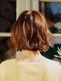 顎ラインのボブベースに無造作なパーマをかけました!重たくみえがちなボブですがパーマと表面のハイレイヤーにより軽さと動きを出しています!カラーはツヤがでやすいオレンジブラウンです!