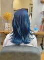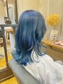 全体をブリーチで明るくし、深みのあるネイビーと透明感の出るアッシュを混ぜたネイビーアッシュにカラーしています。ブルー系のカラーは重めになりがちですが、アッシュを混ぜることで重すぎず透明感のあるカラーになります。