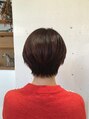 カットはショートレイヤーで、後頭部の丸みを残して全然を軽くしました。サイドは耳にかかるギリギリの長さです。カラーは、ピンクの7トーンです。艶のある暖色系でカジュアルなショートを品のある大人っぽく仕上げました。