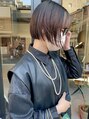 ぷつっと切りっぱなしボブ。襟足ギリギリ、おさまりのいいスッキリしたスタイルです。コンパクトで、スタイリングもしやすくしています!少し前下がりのラインなので、耳にかけた時も綺麗なシルエットになります!