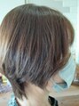 リカームカラー+カットです。もともと少し硬めの髪質ですが、リカームをすることですこしづつ柔らかくなっています。トップふんわり+襟足すっきりが大変リクエストあります。