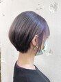 アシンメトリーなデザインのショートボブです☆全体ブリーチしてパープル系カラーの表面をグレージュでカバーリングしました。隙間から覗くパープルが可愛いです♪