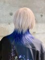 サイドの髪を前下がりにエッジを効かせたウルフスタイルです。ホワイトに近いぐらいブリーチをしたベースに表面はホワイトブロンド、襟足はブルーにカラーリング!ツートーンカラーが映えてますね!ネオウルフ×ブルーインナーカラー/大宮グランアージュ