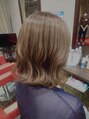 全体にハイライトを入れて透明感のあるカラーに。ベースのカラーはプラチナブラウン。カットは肩につくギリギリの長さで切り、内巻き、外巻きでもセットしやすい長さにしました。