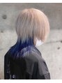 サイドの髪を前下がりにエッジを効かせたウルフスタイルです。ホワイトに近いぐらいブリーチをしたベースに表面はホワイトブロンド、襟足はブルーにカラーリング!ツートーンカラーが映えてますね!ネオウルフ×ブルーインナーカラー/グランアージュ 錦糸町