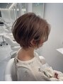 ミニーショートです。顔周り頬骨にかかる位置でカットすることで輪郭を小さく見せます。トップ周辺に重さを残し毛先を軽くすることで大人可愛い動きのあるヘアスタイルに仕上がります。カラーリングはミルキーベージュで透け感のある調合となります。