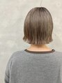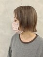 ハイトーンベージュのぱっつんボブは艶感が出るよウニオイルでウエット仕上げ。前髪は長めでオトナっぽくしました。