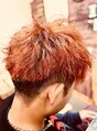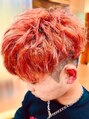 直毛で硬毛なので動きを出すためにツイストパーマをON!ボリュームが出すぎて頭が大きく見えないようにツーブロックの位置と毛量調整とパーマの質感を計算して。さらにブリーチしてからのハイトーンのレッドカラーでインパクトもあるオシャレヘアに大変身。