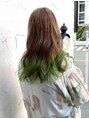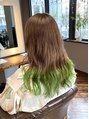 【気に入ったスタイルはブックマークしお使い下さい♪】1ブリーチでできる、ココアブラウンベースに黄緑の裾カラー♪グレージュ シークレットハイライト カーキアッシュ 寒色系カラー ワイドバング ビビットグリーン 冬カラー 抜け感ヘア