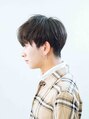 目にかかる絶妙な長さのバングがセクシーさもひきだします。ネープはタイトに刈り上げでスッキリ今っぽくしました。サイドはツーブロックにせず、丸みを残すようにカット。
