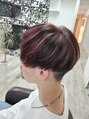 ハイライトとローライトを組み合わせた3Dカラー。赤と黒のツートーンのコントラストがカッコいいマッシュスタイル。アイロンで動きをつけても◎