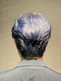 うねるようなウェーブのくせ毛を、ナチュラルで美しい毛流れになるようデザインしたメンズショートヘア。ビビッドすぎないブルーグレージュのカラーが大人の知的な印象を引き立てています。ブリーチオンカラーで金髪へと色落ちしていく変化も楽しめます。