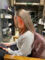全頭ブリーチから作るデザインカラー。インナーがブラッドオレンジにベースが透明感あるミルクティーグレージュです!ブリーチ回数1、2回は必要になります!お気軽にご相談も下さい♪