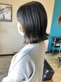 切りっぱなしのボブベースで外ハネに仕上げまして、暗めのアッシュブラックで色持ちよく透明感を◎
