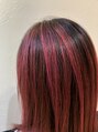 全体にケアブリーチでデザインをいれその上からピンクパープルで色味をプラスして個性的なデザインに仕上げました。
