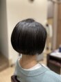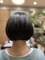 カラーで黒染めした前下がりボブです。襟足ギリギリ短く設定したラインでの前下がりスタイル。程よく軽さもだし黒髪の凛とした女性を表現したスタイルです。