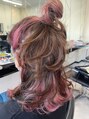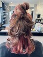 全体ベージュ系 インナーピンク系お仕上げはハーフアップにスタイリングゆるめに巻いたゆるふわなハーフアップスタイルはピンク系カラーと相性が良く可愛いいお仕上がりになりますご自身でも簡単にスタイリングしやすいです