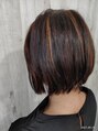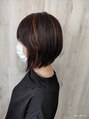 顔周りながめのショートボブで梳きバサミは部分的に少しだけにしてあとはストロークカットで見た目は重めでも手ぐしが通りやすく髪を整えやすく設定しましたカラーは明るくせずに暗めメッシュでオシャレ感を出しました髪が伸びて結んだときも見える位置に!