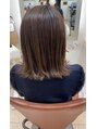 カットは肩につくぐらいの長さで自然に外ハネになるように設定しています。 カラーは全体にパキッと出ない、ナチュラルで上品な大人ハイライトを細めにいれて、上からベージュの色をのせてギャルにならない上品な大人ハイライトカラーに仕上げています。