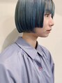 ショートから伸ばし中の段階でぱつっと揃えてミニボブに。サイドの伸びかけの髪もラインを出して個性的ボブに。カラーは伸びてる根元はあえて残してくすみブルーに。色落ちはグレーっぽく。