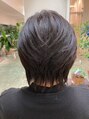 後ろ長めのショートスタイル。トップにボリューム出してサイドは流して束感を入れています。