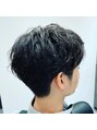 マッシュベースのツーブロックスタイルです。フォルムが丸くならないようにトップにレイヤーを入れて、ネープはネープレスになりすぎないようにカット。洗いざらしの大人っぽい雰囲気をイメージしてパーマをあてています。