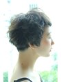 リップラインのショートボブスタイルです。基本は前下がりですが顔まわり、トップにはレイヤーが入って軽いスタイルとなっています。毛先中心にかけたパーマにより、ランダムな毛束感とラフな動きが出るようになっています。