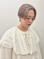 ハイトーンカラーのホワイトラベンダーベージュにセンターパートのぱっつんショートを合わせた カッコかわいいスタイル。しっかりウエットでストレート感をだしたのがポイントです。