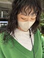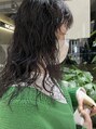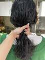 ぐりぐりの強めパーマ。前髪までしっかりかけているので個性的でとっても可愛いヘアスタイルです。濡らしてオイルとバームを混ぜて使うことでウエットな質感に仕上げています。