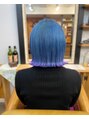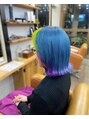 ダブルカラーはお任せください!カットはきりっぱなしボブウルフ^ ^カラーはしっかりブリーチしてからベースカラーはブルー、インナーカラーはパープル、フェイスフレーミングをイエローにする事でかき上げたり、耳にかけても可愛いデザインです^ ^♪