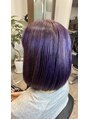 2回か3回全頭ブリーチ後にアルカリカラーと塩基性カラーのディープパープル、ラベンダーパープル、モカを少々ミックスしたカラー剤をグラデーション状にオン。仕上げは140℃ストレートアイロンで艶感を出します。